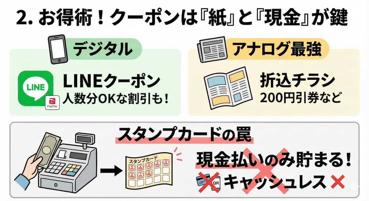 - 「200円割引」など、人数分使える強力なクーポンがあることも。