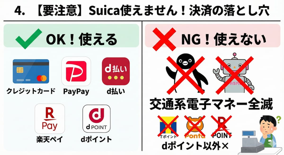 デジタルとアナログ、両方のチェックが重要です。特に「スタンプは現金のみ」という点に注意しましょう。
