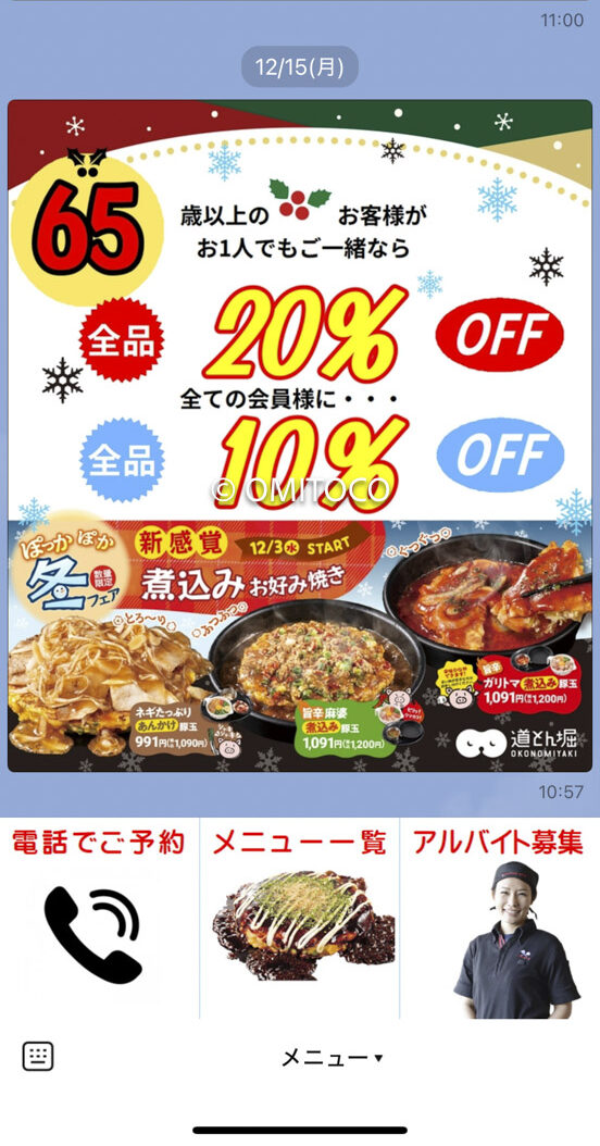 各店舗のLINE公式アカウントを友だち登録すると、初回限定で10%OFFなどのクーポンが届くことがあります。