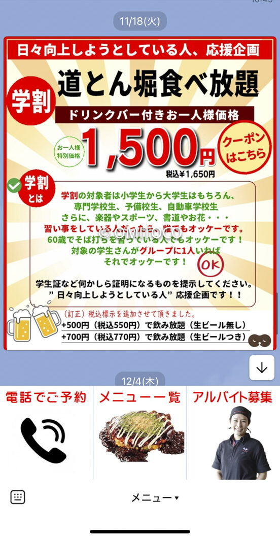かわりに学割で食べ放題1500円クーポンが配信されることがあります↓