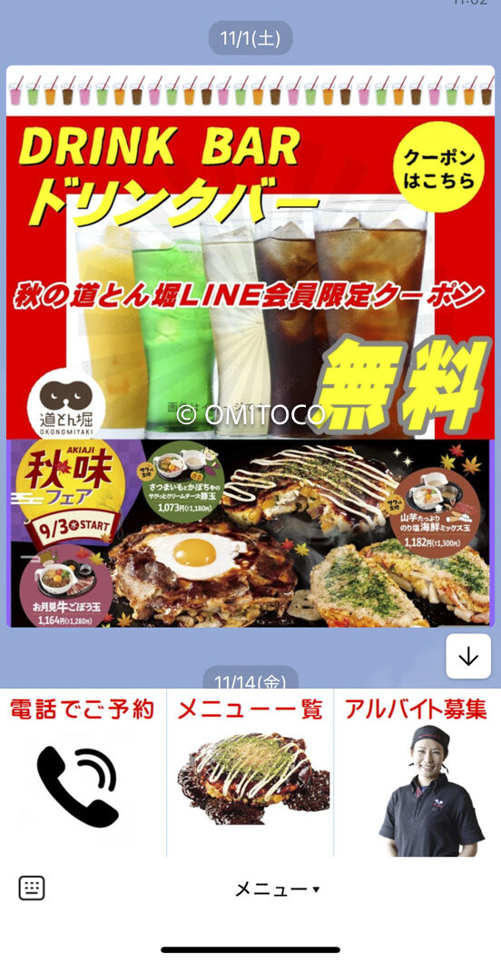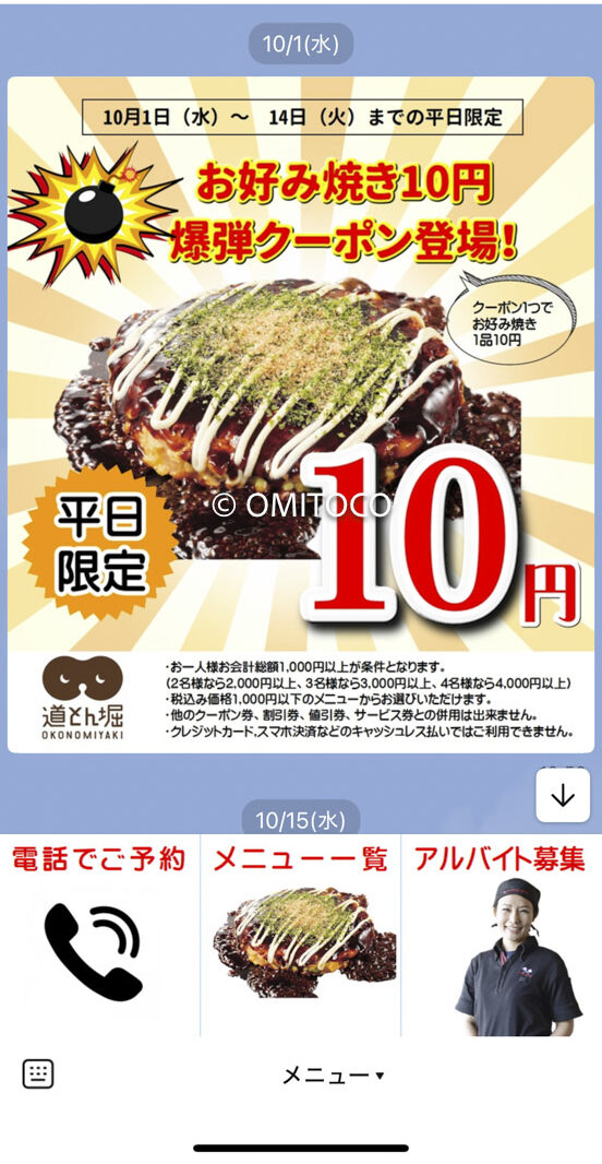 特に「お好み焼き1枚10円」といったクーポンが届くこともあるため、事前の登録が絶対におすすめですよ!