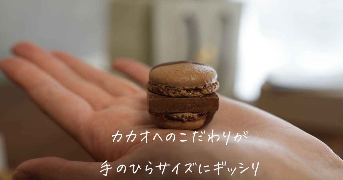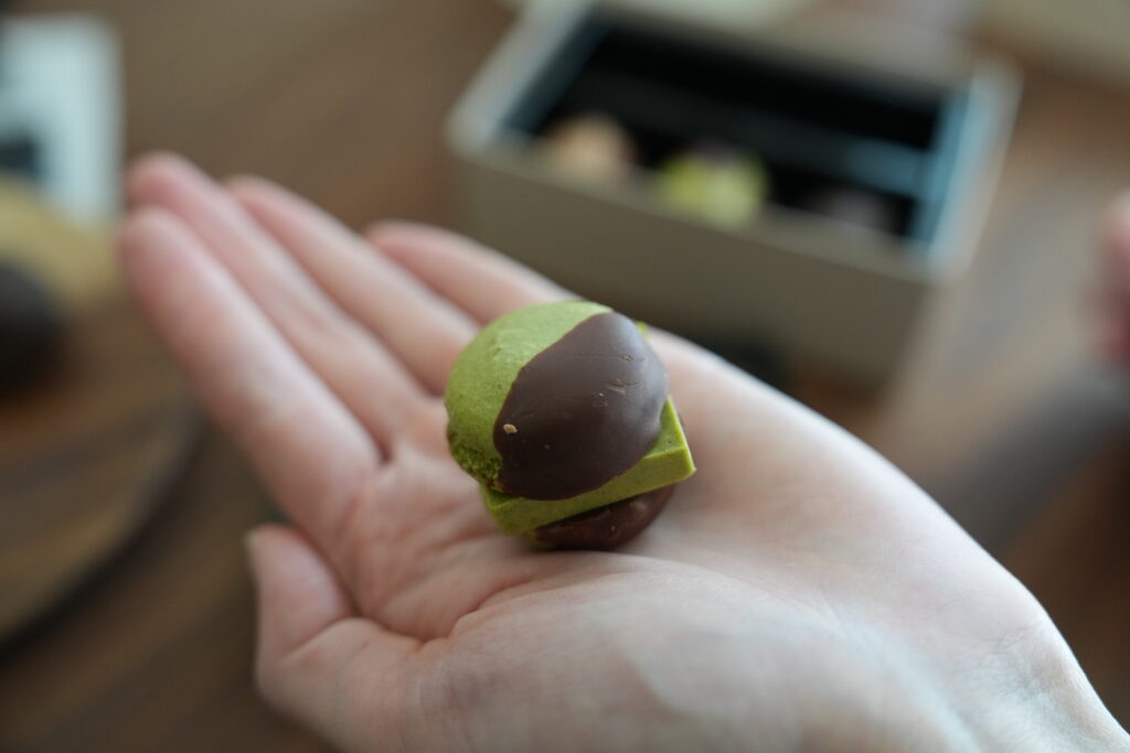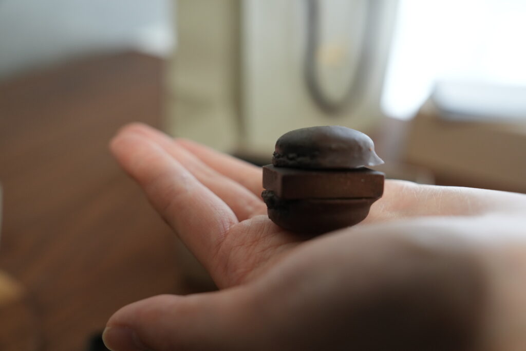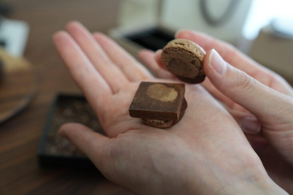 口の中でジュワ〜ととろける生チョコと、モチモチのマカロンの食感を楽しみながら、鼻からチョコレートのいい香りが抜けていきます。