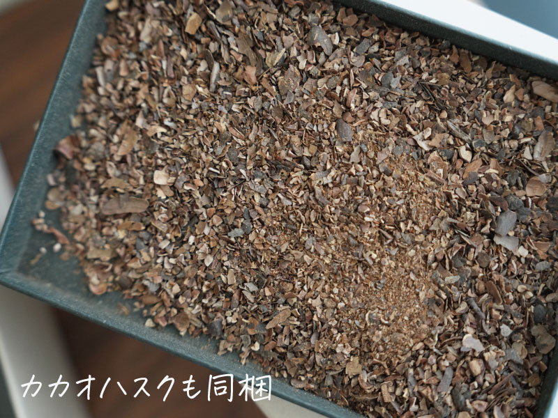 パッケージ開封後、すぐ目にはいるのがカカオハスク(カカオの皮)。