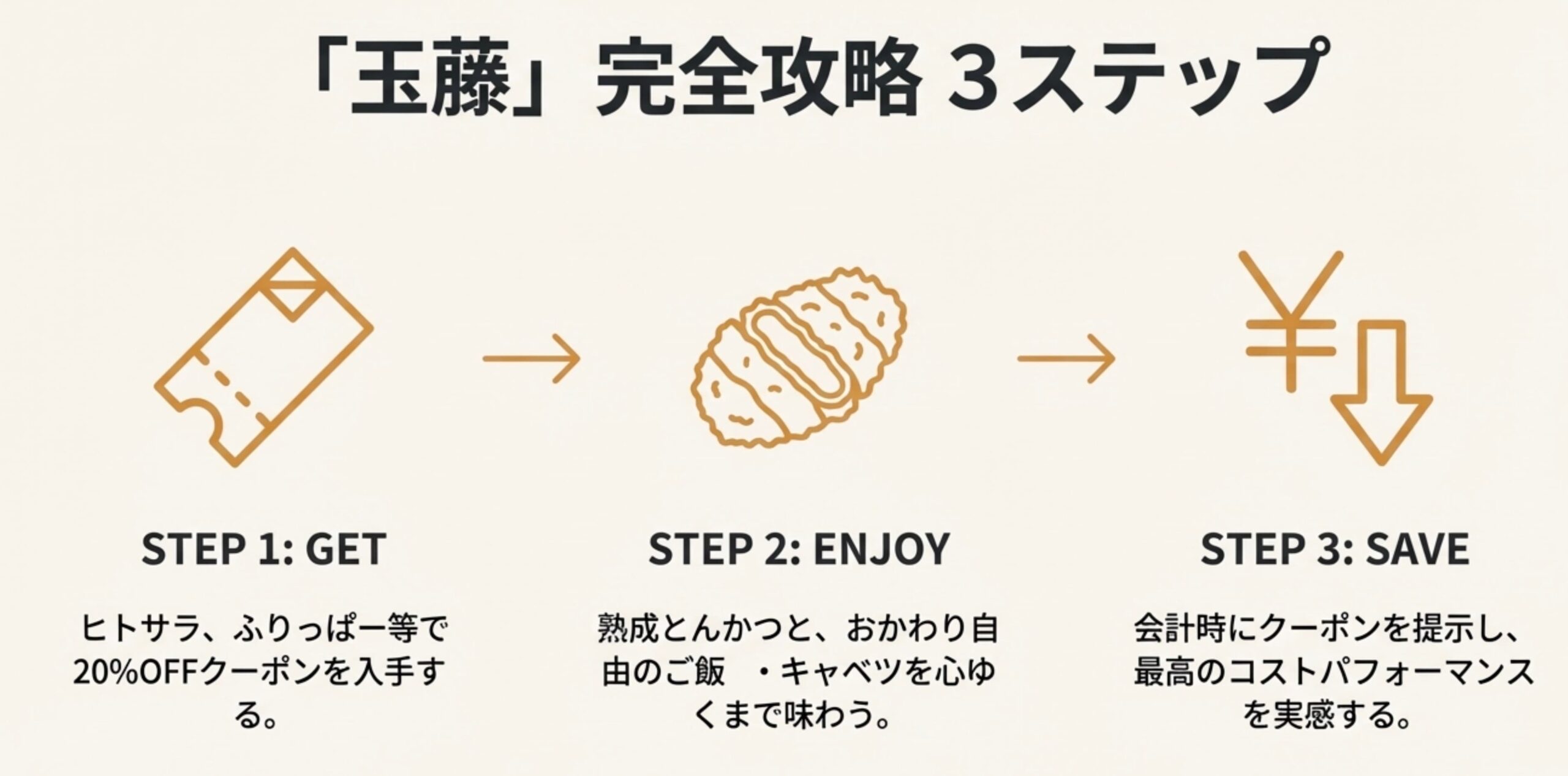 玉藤では、一度訪れてクーポンを使えば、会計時にまた次の割引券が手に入り、職人が揚げる熟成とんかつを常に賢く、お得に楽しみ続けることができますよ!