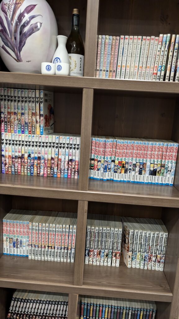 ロビーに日本語漫画が揃っています。